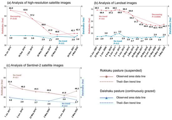 Temporal variation in pasture area using satellite imagery. (a) High-resolution satellite images, (b) Landsat images, and (c) Sentinel-2 images. Each plot’s horizontal axis represents the timeline of satellite observations, whereas the dual vertical axes denote the respective areas of the Rokkaku (left) and Daishaku (right) pastures, quantified in hectares. The red solid line with circular markers is the observed area data for the Rokkaku pasture, whereas the red dashed line presents its Theil–Sen trend line. Similarly, the Daishaku pasture’s observed area data are represented by the blue solid line with triangle markers, with its Theil–Sen trend line presented as the blue dashed line. p-values were determined using the Mann–Kendall significance test. p ≥ 0.05 indicates no trend, whereas p < 0.05 indicates a statistically significant increase or decrease.