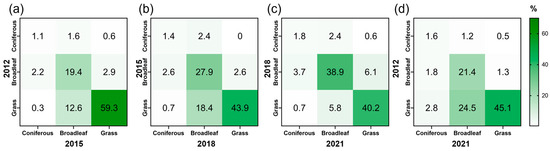 Vegetation was grouped into three categories (grasses, broadleaf trees, and coniferous trees) in multispectral images using the pixels-based maximum likelihood method. To differentiate these classes, we relied on their distinct spectral signatures. Grasslands, with their mix of photosynthetic vegetation and soil, differ spectrally from forests, which combine photosynthetic and woody vegetation, soils, and shadows [32]. Previous studies have highlighted the importance of visible wavelengths in differentiating tree types [33] notably, conifers, attributed to their reduced photosynthetic activity in the blue band [34]. We evaluated the classification accuracy using a confusion matrix. To examine the temporal changes, we compared the pasture areas extracted from the land-cover classification maps of the two test sites. To investigate the spatial variations in vegetation, we generated a change map using classification maps derived from high-resolution satellite images captured in 2012, 2015, 2018, and 2021. For consistency in our spatial analysis, we standardized all four classification images to a resolution of 6 m, given that the lowest spatial resolution in the high-resolution data was from SPOT. Subsequently, a pixel-by-pixel comparison of the two time points was conducted. The spatial structure indices calculated in this study were the area occupied by each vegetation category along with their respective percentages. Analyzing the proportionate distribution of each category, we were able to estimate the variations in the expanse of each type of vegetation over time. We then categorized the transformations observed during the 2012–2015, 2015–2018, 2018–2021, and 2012–2021 periods into three categories: changes from grasses to broadleaf trees, changes from grasses to coniferous trees, and no-change regions.