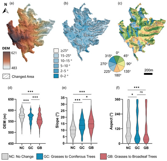 The distribution of the slope also differed significantly across the three groups (Figure 6e; p < 0.05). The mean values of slope degree for the changed groups (GB: 15.0° and GC: 13.9°) were greater than that of the group with no changes (10.3°). These areas of vegetation change, both in GB and GC, tended to be associated with steeper slopes than those of areas with no significant vegetation change.