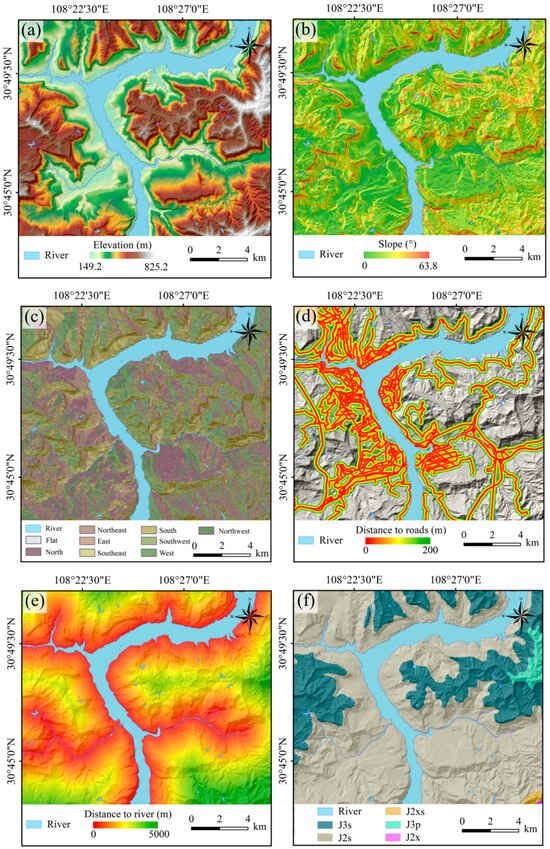 Water flow can accelerate soil erosion and weaken soil strength [41], while vehicular traffic on roads and surrounding structures can exert additional loads [42]. Collectively, these factors contribute to the risk of slope instability. Therefore, the distance to the river and the distance to roads were calculated by Euclidean distance tools in ArcGIS based on vector data of rivers and roads in the study area and subsequently incorporated into the dataset.