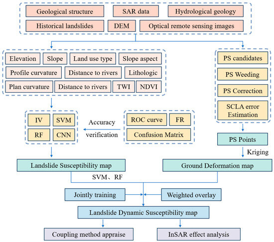 In summary, this study aimed to compare the performance of different coupled models, find the optimal method for updating the LSM with InSAR deformation data, and obtain the best landslide dynamic susceptibility assessment model. The study in this paper was conducted in three stages: (1) Based on the landslide-related factor data in the study area, we constructed IV, SVM, RF, and CNN models to obtain the LSM; validation assessment and performance comparison of the selected models indicated that RF and SVM exhibit the best performance. (2) Using weighted overlay and joint training methods, the SVM and RF models are coupled with the InSAR deformation data to construct dynamic susceptibility models and generate the LDSM. (3) We compared the accuracy of the applied dynamic susceptibility models based on various statistical indicators, appraised the applicable coupling method, and analyzed the role of the InSAR deformation data in model through LDSM.