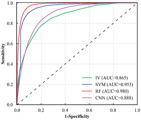 Various statistical model evaluation metrics enable a comprehensive assessment of model accuracy from different perspectives, facilitating a quantitative performance comparison. The ROC curve is a valuable tool for assessing model performance, and the AUC value can provide an intuitive representation of predictive accuracy. According to Figure 6, the AUC values for the IV, SVM, RF, and CNN models are 0.865, 0.953, 0.980, and 0.888, respectively. All models have AUC values above 0.8, indicating their competence in landslide prediction. Notably, the RF and SVM models outperform the others in terms of the AUC value, with the RF model achieving the highest AUC value of 0.980.