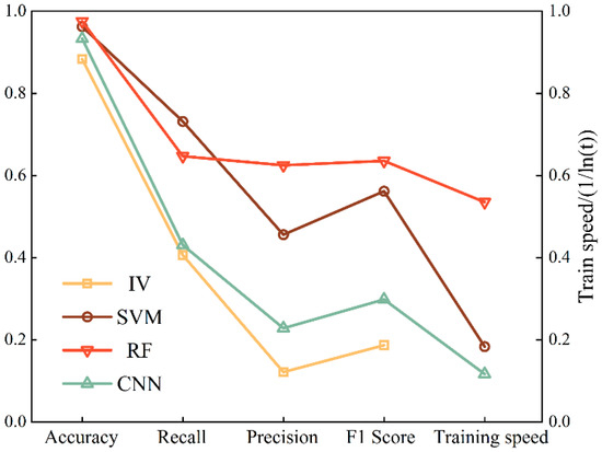 The confusion matrix is used to compare the classification results with the actual circumstances and measure the classification performance of models by deriving the parameters of accuracy, recall, precision and F1 score. Models with higher accuracy, F1 score, and a balance in recall and precision are typically regarded as performing better. Figure 7 portrays the accuracy, recall, precision, F1 score, and training speed of the selected models, respectively. For the sake of convenient comparison, the training speed is represented by the natural logarithm of the training time (except for the IV model). As shown in Figure 7, most models perform well in accuracy but show subpar performance in precision. The RF model exhibited the best performance metrics, with an accuracy of 0.976, a recall of 0.647, a precision of 0.625, an F1 score of 0.636, and the shortest training time compared to the other ML models. These indicators suggest that the model performance is ranked as: RF > SVM > CNN > IV.