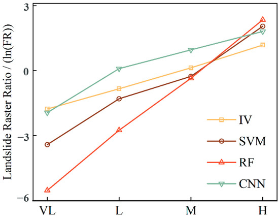 FR is a reliable technique for quantifying the ability to express landslides within different susceptibility zones. To mitigate the differences in magnitudes and facilitate a more convenient comparison, natural logarithm processing was applied to FR, and the results are presented in Figure 8. Models with a higher FR in the H susceptibility zone and a lower FR in the M, L, and VL susceptibility zones are regarded as possessing enhanced classification capabilities. As shown in Figure 8, the prediction results of the SVM and RF exhibit higher landslide raster ratios in the H susceptibility zone and lower values in other susceptibility zones. In contrast, the IV and CNN models show lower landslide raster ratios in the H susceptibility zone but higher values in other susceptibility zones. The results indicate the superior ability of SVM and RF to distinguish landslide-prone areas.