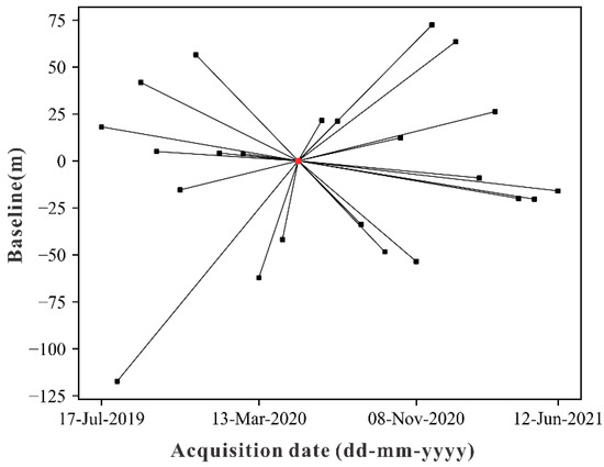 Based on the SAR dataset, persistent scatterer interferometry (PSI) was conducted in ENVI 5.6. The scenes were paired to create 23 connection graphs, and the baseline is illustrated in Figure 9. Subsequently, interferometric processing, two inversions, and geocoding were performed, resulting in a deformation dataset containing 260,039 PS points. The parameters used in the PS process are detailed in Table 4.