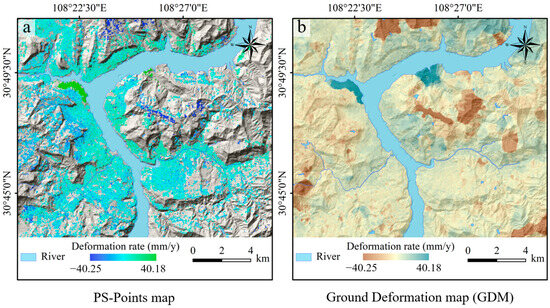 PS-InSAR employs interferometry synthetic aperture radar technology in conjunction with persistent scatterers (PS) to monitor subtle surface deformations [63,64]. Based on time-series InSAR data and the single master interferogram method, we conduct operations of registration, clipping, and noise reduction on multiple PS points within the image area of study, resulting in the generation of time-series deformation data for these PS points [65]. Subsequently, an interpolation method was applied to generate a ground deformation map (GDM) by integrating the PS points within the study area. This map provides precise measurements of surface subsidence, uplift, and displacement, thus serving as a valuable basis for the timely identification of potential geological hazards [66].