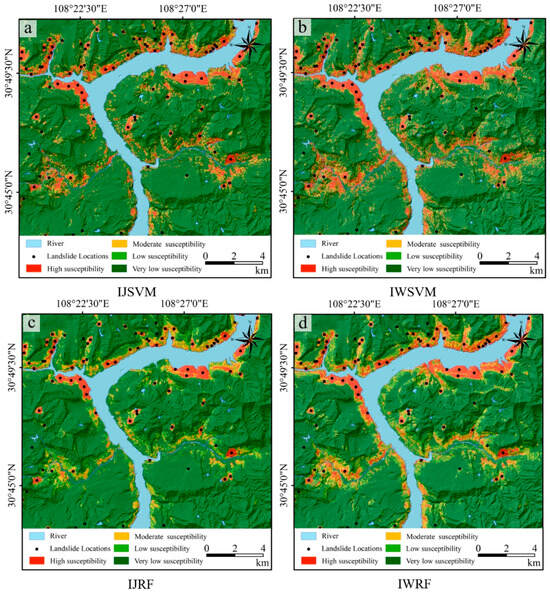 Landslide susceptibility maps: (a) LSM by IV, (b) LSM by RF, (c) LSM by SVM, and (d) LSM by CNN.