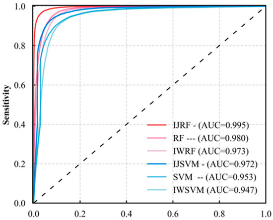 We employed ROC (receiver operating characteristic) curves, a confusion matrix, and the FR (frequency ratio) to quantitatively evaluate the accuracy and performance of models. The ROC curve is one of the most used accuracy evaluation methods in probabilistic models. The curve is constructed using specificity and sensitivity based on the model’s prediction results and evaluates the model accuracy through the AUC (area under the ROC curve) [60]. AUC values fall within the interval of [0.5, 1], and a higher AUC value approaching 1 indicates a better model accuracy, while a value near 0.5 suggests the model lacks predictive capability [61].