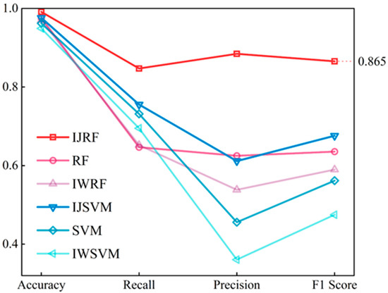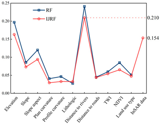 The importance of landslide-related factors in the RF and IJRF models is depicted in Figure 15. Factor importance indicates the extent to which each factor influences the model’s classification performance, signifying how each factor helps the model explain the relationships of landslides and related factors. According to Figure 15, these two models share a similar distribution of factor importance, with the distance to rivers being the most crucial factor in both cases, while lithology, distance to roads, land use type have lower factor importance. After the inclusion of InSAR deformation data as a factor, the importance of other factors in the IJRF model slightly decreased, with InSAR deformation data having an importance score of 0.154, ranking third among the twelve factors. In the IJRF model, InSAR deformation data as a factor provides discriminative information between landslide and non-landslide samples, playing a significant role in the RF model’s classification decisions, thereby enhancing the model’s performance.