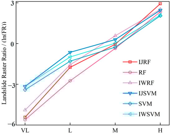 FR values represent the landslide proportions in the VL, L, M, and H susceptibility levels for each model. These FR values are naturally logarithmically scaled and are presented in Figure 14. From the figure, it can be observed that SVM and its coupled models have higher landslide proportions in the VL and L susceptibility areas but lower proportions in the H susceptibility areas. That indicates its poor discrimination ability in distinguishing landslide susceptibility areas. On the other hand, the RF and its coupled models have both lower landslide proportions in the VL and L susceptibility areas and higher proportions in M and H partitions. Notably, the IJRF model, while having a lower proportion of landslide areas in the VL susceptibility area, has the highest proportion of landslide areas in the H susceptibility area, indicating the superiority of the IJRF model in discriminating landslide susceptibility areas from non-landslide susceptibility areas.