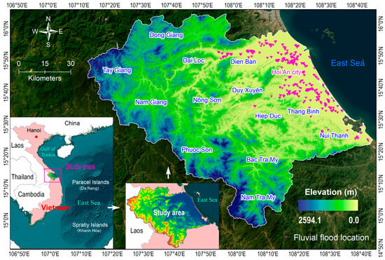 The research area encompasses Quang Nam province, situated within the central coastal region of Vietnam and spanning an area of 3173.4 square kilometers. Geographically, it extends from 14°56′ to 16°04′ north latitude and from 107°11′ to 108°44′ east longitude (Figure 1). The topography is diverse and ranges from coastal areas with sandy beaches to rugged mountains, fertile plains, and river valleys. The elevation ranges from 0 to 2594.1 m a.s.l, with the mean and the standard deviation at 466.9 m and 405.5 m, respectively. The Truong Son range dominates the western part of the province [30], a mountainous region that runs parallel to the coast. Rugged terrain, dense forests, and high peaks characterize this region.