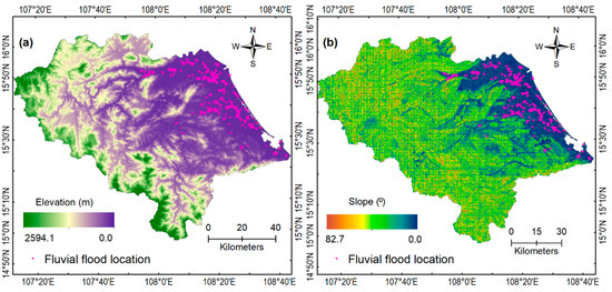 In the first step, a fluvial flood database for the Quang Nam province was established using ArcGIS Pro 3.0 in the ESRI-geodatabase format [65]. Then, the reference system of WGS 84 UTM Zone 48 (Projection: Transverse Mercator, Central Meridian: 105.0, Scale Factor: 0.9996, Latitude of Origin: 0.0) for the study was specified for the database. Next, the twelve flood indicators (elevation, slope, aspect, relief amplitude, TWI, stream density, geology, LULC, soil type, NDVI, NDWI, and rainfall) and 4156 flood locations were imported into the database. All twelve flood indicators were converted into a raster format with a 30 m resolution. It should be noted that among the 12 flood indicators, aspect, geology, LULC, and soil type are categorical indicators. Therefore, a transformation process, as described in [20], was used to convert these indicators into continuous indicators.