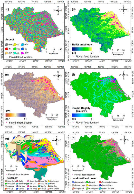 Geology was incorporated into this analysis due to its impact on drainage characteristics, channel formation, and capacity for water conveyance [49,50]. This is because various rock types and geological formations can either facilitate or impede water flow. This study generated a geological map (Figure 3g) using a categorization scheme comprising 20 distinct classes. The source data for this map were derived from the Geological and Mineral Resources Maps [51], available at a scale of 1:200,000, as provided by the Ministry of Natural Resources and Environment of Vietnam.