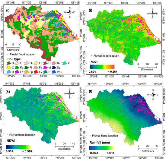 Soil type is a crucial parameter in flood modeling due to its direct relevance to infiltration patterns and runoff processes, which are fundamental factors in flood dynamics [53]. According to Zhan and Ng [54], different soil types exhibit varying degrees of permeability, influencing the speed at which water can either infiltrate into the ground or flow over the surface. The soil type map utilized in this study consisted of 18 distinct categories, as depicted in Figure 3i. The soil type data were sourced from national pedology maps at a 1:100,000 scale, which were provided by the Ministry of Agriculture and Rural Development of Vietnam.