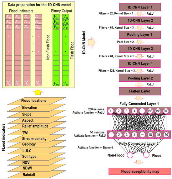 In a 1D-CNN, the network structure typically consists of the input layer and one or more convolutional layers, followed by pooling layers, flattening, fully connected layers, and the output layer [64]. The purpose of the 1D-CNN in the context of fluvial flood susceptibility mapping is to build a prediction model that infers the flood indicators to output flood susceptibility indices.
