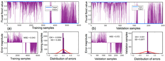 By utilizing the training dataset consisting of 5818 samples, the 1D-CNN model was trained, adjusting a total of 71,088 weights that were optimized through the ADAM algorithm. The result is presented in Table 4 and Figure 6a. The result shows that the obtained accuracy (Acc) was 94.3%, the F-score was 0.944, the Kappa value was 0.886, the area under the curve (AUC) was 0.981, and MSE was 0.043, demonstrating a robust correspondence between the trained 1D-CNN model and the training dataset. In addition, the error of the 1D-CNN model followed a normal distribution curve (Figure 6a). The sensitivity (Sens) and specificity (Spec) values stood at 92.0% and 96.8%, indicating the model’s ability to accurately discern floods and non-flood events at these rates, respectively. The positive predictive value (PPV) and negative predictive value (NPV) were 97.0% and 91.5%, respectively, signifying the 1D-CNN model’s precise classification of floods and non-flood events at these respective percentages.