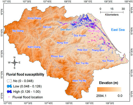 After successfully training and validating the 1D-CNN model, the model was utilized to generate a fluvial flood susceptibility map for the entire study area. Herein, the probability value of the flood class was used to indicate fluvial flood susceptibility.