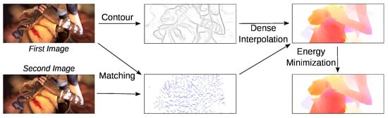 The computational process of EpicFlow commences with two input images. Matches are determined using DeepMatching [45], and edges from the initial image are extracted using SED [46]. These data points are subsequently employed for high-density match interpolation, producing a detailed dense correspondence field that initializes a single-level energy minimization framework. Figure 2 provides an overview of the key steps in the EpicFlow procedure.