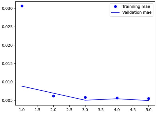 Training and validation MAE trends. The blue dots represent the training MAE, and the blue lines represent the validation MAE. The horizontal axis represents epochs, and the vertical axis represents the error for each epoch.