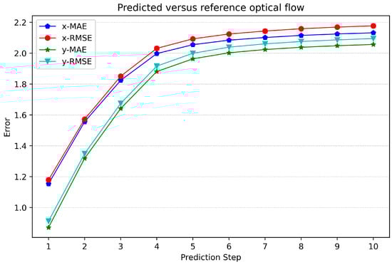 It is important to note that, despite this gradual decline in performance, our model consistently maintains a high level of accuracy. Even after 10 prediction steps, which is a substantial time horizon, the error values remain impressively low and exhibit remarkable stability. This robust performance over an extended forecast horizon highlights the model’s reliability and suitability for applications requiring accurate optical flow predictions.
