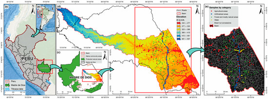 Location of the study area: (a) South American scale; (b) Peruvian scale; (c) regional scale; (d) the micro-watershed level of the Manuripe River and (e) field survey points in the study area.
