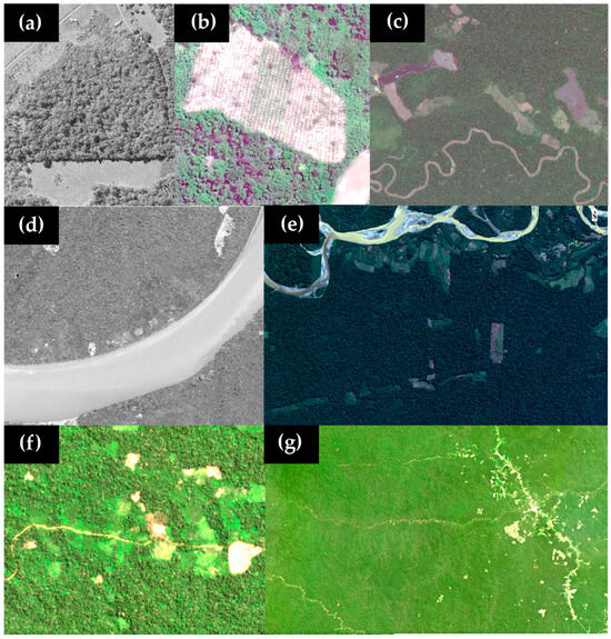 Validation of forested and mostly natural areas, agricultural areas, and water surfaces with WorldView images at 0.38 m × 0.38 m spatial resolution (a–c), PeruSAT-1 at 0.7 m × 0.70 m spatial resolution (d), and 2.8 m × 2.8 m (e) spatial resolution, and PlanetScope images at 3 m × 3 m spatial resolution (f,g).