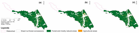 Land use in Brazil nut forest concessions in the micro-basin of the Manuripe River–Madre de Dios, for the years 2004 (a), 2012 (b), and 2020 (c).