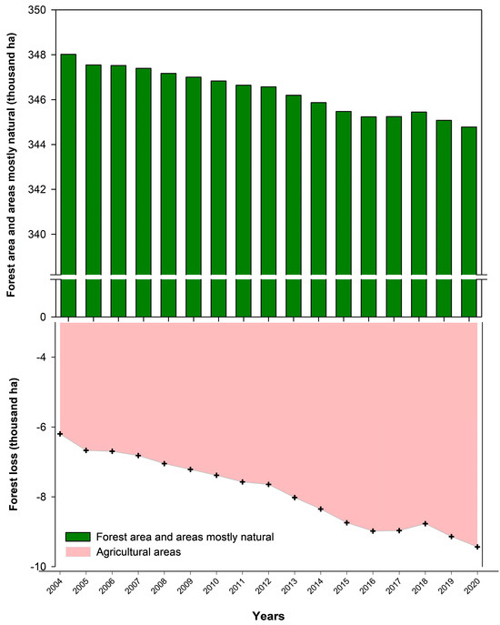Our results showed that the main cause of forest conversion in the study area was agriculture. In 17 years (2004 to 2020), 9435.12 ha of forest were lost, with an annual rate of 160.11 ha/year (q = 0.046%). The most intense forest loss occurred in 2004–2005 and 2014–2015, with an annual rate of 479.53 ha/year and 394.68 ha/year, respectively. Despite the increase in forest loss due to agriculture, there were also decreases in some years. This was due to the presence of abandoned or temporarily uninhabited areas where natural regeneration occurred through successional processes, but the vegetation cannot be considered forest: 10.35 ha in 2017 and 200.61 ha in 2018, with an annual loss rate (q) of −0.003 (10.35 ha/year) and −0.058 (200.16 ha/year). During the study period, 4681.36 ha of forest were converted for agricultural use.
