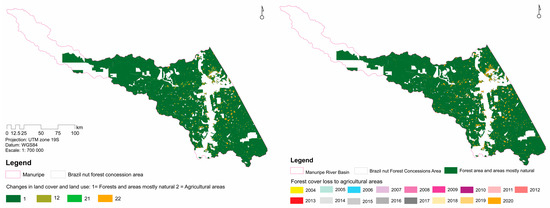 Land cover and land-use changes in Brazil nut forest concessions in the Manuripe River micro-basin–Madre de Dios between 2004 and 2020: left, global change; right, historical change.