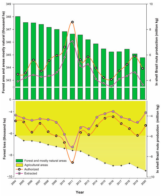 It can be observed that there is an inverse relationship between forest loss and authorized and extracted Brazil nut production (Figure 6). There is also a minimal but progressive increase in forest loss that negatively affects Brazil nut production (Figure 6). This was identified when evaluating Brazil nut production using Landsat spatial data quantification. From the historical production of Brazil nuts with respect to forest loss and changes of use, peculiar data are noted in the years 2010 and 2011. There was a higher level of authorized (6.62 million kg–9.08 million kg) and extracted (5.81 million kg–7.57 million kg) Brazil nut production (Figure 6). In general, however, production follows a decreasing trend alongside rising forest loss.