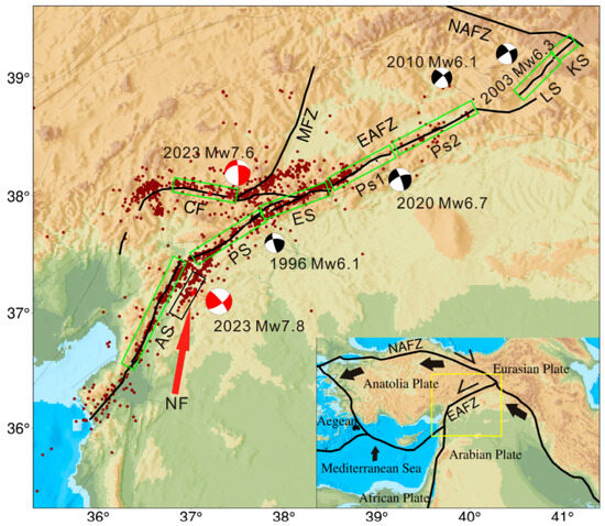 This event follows a number of large earthquakes that occurred along the EAFZ in the 19th and 20th centuries, including the 1986 Mw 6.1, 2003 Mw 6.3, 2010 Mw 6.1, and 2020 Mw 6.8 earthquakes [7]. Most of these earthquakes occurred to the east of Erkenek [8]; in contrast, the fault to the west (the Pazarcık and Amanos segments) has been largely locked for more than a century and has accumulated a significant amount of energy.