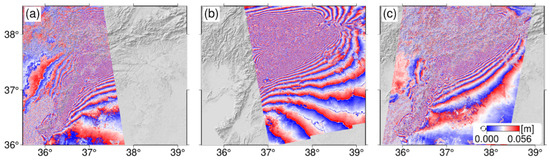Interferograms of the 2023 Turkey sequence. (a) Interferogram of ascending track T14 based on the differential interferometric synthetic aperture radar (D-InSAR) method. (b) Interferogram for ascending track T116 based on the D-InSAR method. (c) Interferogram for descending track T21 based on the D-InSAR method.