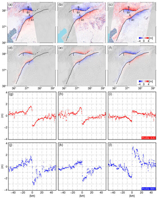 (a–c) Coseismic deformation of the 2023 Türkiye-Syria seismic sequence along the range direction for ascending tracks T14 and T116 and descending track T21. Black lines represent fault rupture traces based on surface deformation. (d–f) Downsampled points for ascending tracks T14 and T116 and descending track T21. (g–i) Profiles of ascending tracks T14 and T116 and descending track T21 (red, AA1 profile). (j–k) Profiles of ascending tracks T14 and T116 and descending track T21 (blue, BB1 profile). AA1 indicates a 30 km long by 0.1 km wide section line along the southern branch of the EAFZ (the main rupture zone of the Mw 7.8 earthquake rupture), and BB1 indicates a 30 km long by 0.1 km wide section line along the northern branch of the EAFZ (the main rupture zone of the Mw 7.6 earthquake rupture).