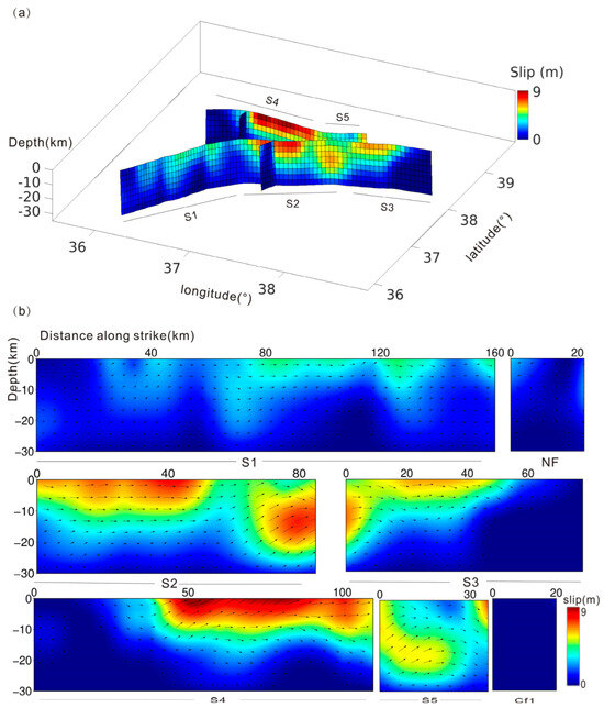 By comparing the results of the field geological study, seismological study, and offset and optical remote sensing image deformation fields, a three-segmented geometric fault surface rupture model (S1–S3) was established for the southern main branch of the EAFZ. In most places, this fault segmentation model is consistent with the surface rupture of the field geological survey of the Mw 7.8 earthquake, which started at NF. For the Mw 7.6 earthquake, we divided the Carkdak Fault into a two-fault segmentation model (S4, S5) according to changes in rupture strike; in addition, we also considered a small vertical fault branch Cf1 (black dashed branch to the left of profile BB1 in Figure 4c), which was observed by combining the distribution of aftershocks with the descending deformation field. Focal mechanism solutions provided by several organisations show that the dip is between 64° and 89°, and the rake angle varies between −1° and 11°. Most of the aftershocks were located at a depth of 20 km. Combining these parameters, we used a four-segment fault model for the Mw 7.8 event and a three-segment model for the Mw 7.6 event to invert the slip distributions. The lower boundary of the fault model was located at a depth of 30 km, and the rake angle was set to (−20°, 20°), taking into account that both ruptures were left-lateral strike-slip motions. The simulated fault for the Mw 7.8 earthquake extended from 36.14°E and 36.12°N (southwest point) to 38.67°E and 38.09°N (northeast point). The modelled fault for the Mw 7.6 earthquake extended from 36.36°E and 37.89°N (the western point) to 38.15°E and 38.24°N (the eastern point). Along the strike and depth directions, we discretised the fault surface into 4 × 4 km patches and constructed the fault model in an elastic and homogeneous half-space.