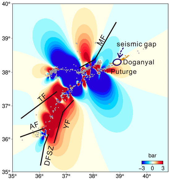 Seismic gaps remain along the EAFZ following the Türkiye-Syria earthquake sequence [20,58]. Therefore, it is crucial to analyse the stress changes in the surrounding faults created by the seismic sequence. We simplified the geometry of the receiving fault by combining historical event source mechanisms and the fault strike. The receiver fault (strike = 277°, dip = 78°, rake = 4°) was based on the GCMT. According to the regional geological background and Coulomb stress research, we adopted μ = 0.4 for the calculation. In the southwestern section of the Malatya Fault, the stress conditions displayed a cyclical pattern of alternating positive and negative states. The middle Puturge Fault, northern DSFZ, Yesemek Fault, Antakya Fault, and Turkoglu Fault are under strong positive stress and remain at high risk of large earthquakes (Figure 8).