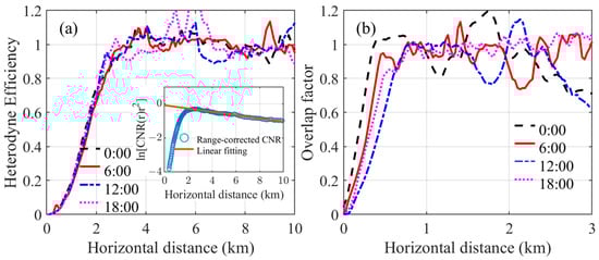 (a) The heterodyne efficiency from four horizontal experiments, which was obtained from the ratio of the range−correct CNR (blue circles) and the linear fit result (orange line), as shown in the subfigure. (b) The overlap factor of the 355 nm channel from three horizontal experiments, measured at 0:00, 6:00, 12:00, and 18:00 local time on 14 February 2023.