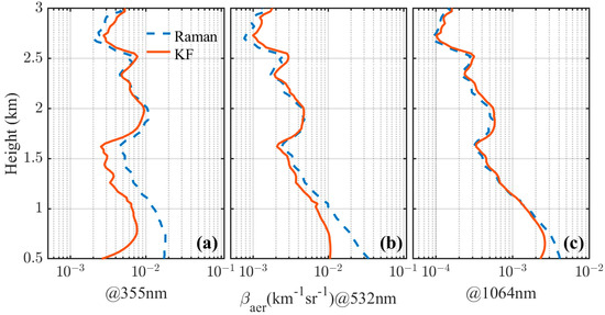 Comparison of retrieval using the Raman method (blue dotted line) and the KF method (red line). Aerosol backscatter coefficient from the data of (a) 355 nm, (b) 532 nm, and (c) 1064 nm lidar observed at 1:30 local time on 20 February 2023. The lidar ratios assumed for KF inversion are 30, 32, and 45. The Angstrom exponent applied in Equation (4) is set as 1.5.