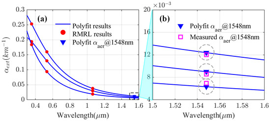 (a) Three groups of aerosol extinction coefficients at a height of 2 km retrieved from the RMRL (red dots); second-order poly fit curves using the extinction coefficients and the wavelength (blue line); aerosol extinction coefficients at the wavelength of 1548 nm derived from the poly fit curves (blue triangle); (b) a magnification of part of (a) from 1.5 to 1.6 μm; aerosol extinction coefficients retrieved from the CDWL (pink square), and the blue lines and blue triangles are the same as in (a), derived from the RMRL. The gray circles indicate the same group of data.