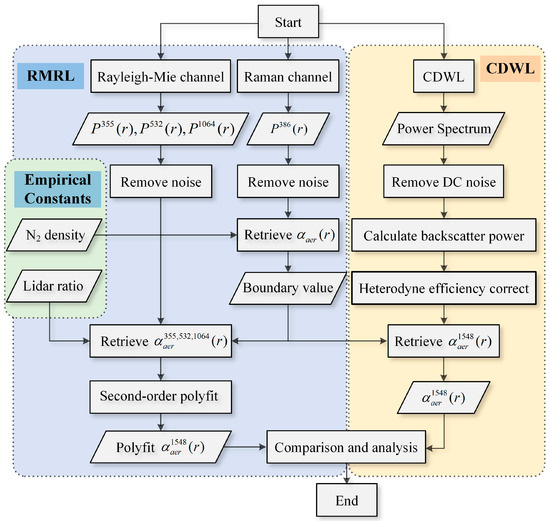 In this way, the data sets of the two lidars were assimilated to the same wavelength and their inversion results could be compared. The data processing procedure is displayed in Figure 4. The number density of Nitrogen molecules was calculated by the profile of temperature and pressure from the Atmosphere model, and the lidar ratio was set as 30/32/45/50 Sr at the wavelength of 355/532/1064/1548 nm.