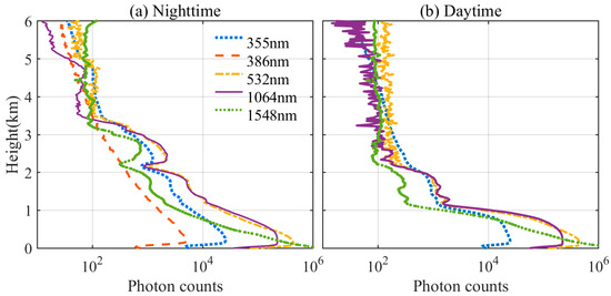 Ten minutes averaged altitude profiles of backscattered signals measured at (a) 0:00 and (b) 12:00 local time on 20 February. The Raman lidar does not work during the daytime. The legend indicates the wavelengths of the backscatter signals in nanometers.