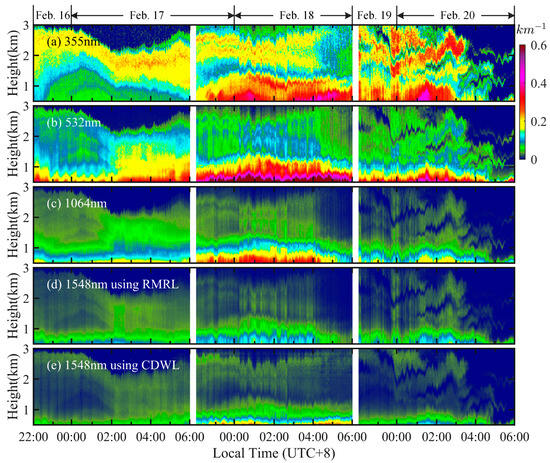 Results of extinction coefficients at the wavelengths of (a) 355 nm; (b) 532 nm; (c) 1064 nm; (d) 1548 nm using the RMRL; (e) and 1548 nm using the CDWL. The results from 22:00 to 6:00 local time on the 16, 17, 18, 19, and 20 February are displayed when the Raman lidar works routinely. The time resolution and height resolution are 1 min and 30 m, respectively.