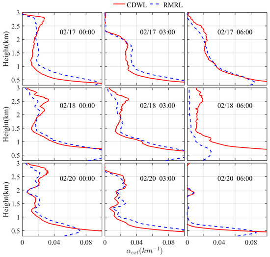 It can be noticed that longitudinal stripes appear in Figure 6, which may mean the internal gravity waves strongly affect the backscatter, particularly at 0:00 on 20 February. To compare the retrieval of extinction coefficients with the two lidars in detail, the results within a height range at the same time are displayed, as shown in Figure 7. It needs to be mentioned that the results vary greatly in the near field (mainly in altitudes ranging below 0.5 km). The signal of the RMRL is uncalibrated in the range of 0–0.5 km due to the lack of a stable overlap factor, while the CDWL is calibrated with a relatively stable heterodyne efficiency. Inconsistent results appear at 6:00 local time on 18 February, the output power of the laser in the RMRL decreases, and the effective detection distance is reduced. Consequently, the measurement of the RMRL shows poor ability in aerosol retrieval, causing a large difference between the CDWL and RMRL.