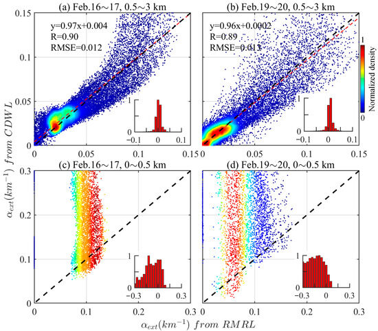 Scatter diagrams of the aerosol extinction coefficients derived from the RMRL and the CDWL. Results ranging from 0.5 to 3 km during the nighttime of the 17 and 20 February are compared in Figure 8 (a,b), respectively. In contrast, results ranging from 0 to 0.5 km are shown in Figure 8 (c,d). The color-shaded dots denote the normalized density. The black dashed lines denote 1:1 lines, and the red dashed lines show the linear fitting results. The distributions of y-x are inserted in the bottom right corner of each panel.