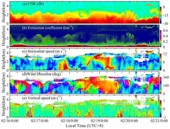 The continuous observation results from 16–21 February are shown in Figure 9, including the CNR, aerosol extinction coefficients, horizontal wind speed and direction, and vertical wind speed. When the Raman lidar does not work during the daytime, the boundary value is set as the interpolation of the result during the night. To ensure the accuracy of the results, the retrieval of wind speed and direction with the CNR less than −17 dB is plotted as white. In Figure 9e, the positive value of vertical velocity is defined as downward, and the upward wind speed appearing every afternoon is consistent with the results of the extinction coefficient, which also confirms the vertical transport process of aerosols. The results prove the aerosol retrieval capability of the CDWL system.
