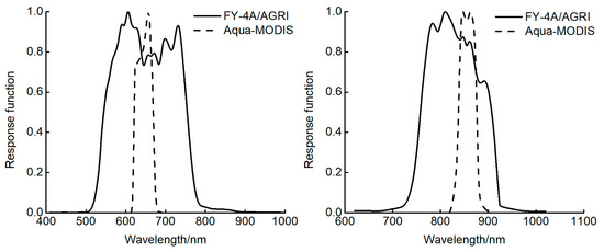 Spectral response function of FY-4A/AGRI and Aqua-MODIS in red band and near infrared band.