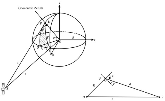 At this time, the satellite zenith angle of the ground point, P, can be calculated using Formula (1) [34].
