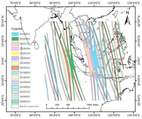 After performing data matching, the matching sample region that simultaneously satisfies the time, space, observation geometry, and field angle conditions is selected, as shown in Figure 5. The sample region is similar to an X shape and presents an approximately symmetric distribution near the equator. The image data of the reference sensor and the unmarked sensor ensure that the same ground object is observed at approximately the same time and observation angle in the matching sample region [40], effectively eliminating the uncertainties related to the atmospheric path, observation geometry, and observation time differences, laying a foundation to ensure the accuracy of the cross-calibration process.