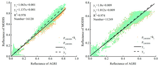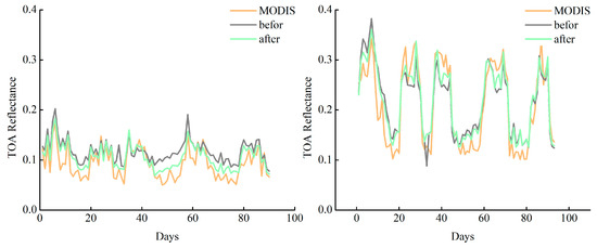 To test the reliability of the SBAFs, the FY-4A/AGRI TOA reflectance is compared with the MODIS TOA reflectance before and after performing SBAF correction based on the uniform region calculated with 16 cross-calibration instances from August 2018 to September 2020. The red band and NIR band contain 16,120 and 11,249 uniform regions, respectively. The approximate subsatellite point region of the geostationary satellite is used as the matching sample region, which is rich in ground objects, and the matching samples of each band calibration process can cover different reflectance intervals. As shown in Figure 6, the horizontal axis represents the TOA reflectance of the FY-4A/AGRI sensor, and the vertical axis represents the TOA reflectance before and after performing MODIS spectral correction, with the red band and NIR band shown from left to right [41]. The values of the two bands exceed 0.97, and the ratios of the MODIS red band and NIR band to the FY-4A/AGRI TOA reflectance values are 1.137 and 1.012, respectively; after SBAF correction, the FY-4A/AGRI TOA reflectance values are 1.063 and 1.0, respectively. The results show that the correlation between the FY-4A/AGRI and MODIS TOA reflectance values is strong, and the TOA reflectance values of the two sensors become closer after performing SBAF correction, indicating that the method of calculating the SBAF by simulating the reflectance of ground objects measured using spectral curves can effectively correct the spectral differences between the corresponding channels of the two sensors. By utilizing the spectrally corrected MODIS TOA reflectance as the simulation value of the FY-4A/AGRI TOA reflectance, the cross-calibration coefficient of the FY-4A/AGRI image data can be calculated more accurately.