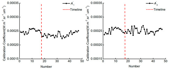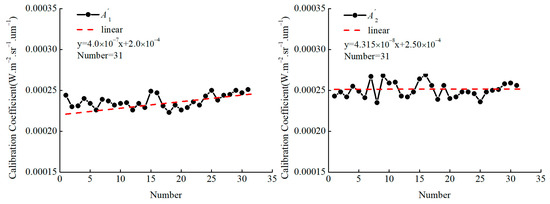 To further study the attenuation phenomena of AGRI sensors with the time spent in orbit, the cross-calibration coefficient curves of the red band and NIR band time series are drawn, as shown in Figure 17, where the dotted red line represents the date of 9 September 2020. The cross-calibration coefficients of the red band and NIR band exhibit an attenuation phenomenon from August 2018 to September 2020. Among them, the gain coefficient of the red band increases from 0.000246 to 0.000252, and the annual decay rate is approximately 1.16%; the gain coefficient of the NIR band increases from 0.000237 to 0.000245, and the annual decay rate is approximately 1.61%. Compared with the annual attenuation rates of the red band and NIR band from October 2020 to December 2022, the attenuation phenomenon is not obvious. The results show that the sensor attenuation problem can be corrected to some extent and that the sensor accuracy can be improved by regularly updating the cross-calibration coefficient.