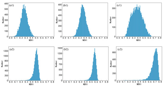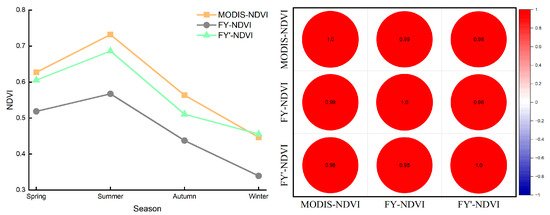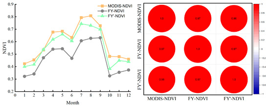 Equation (12) was used to calculate the NDVI before and after FY-4A/AGRI cross-calibration as well as for the MODIS data, respectively, and the monthly NDVI was calculated using the maximum synthesis method.
